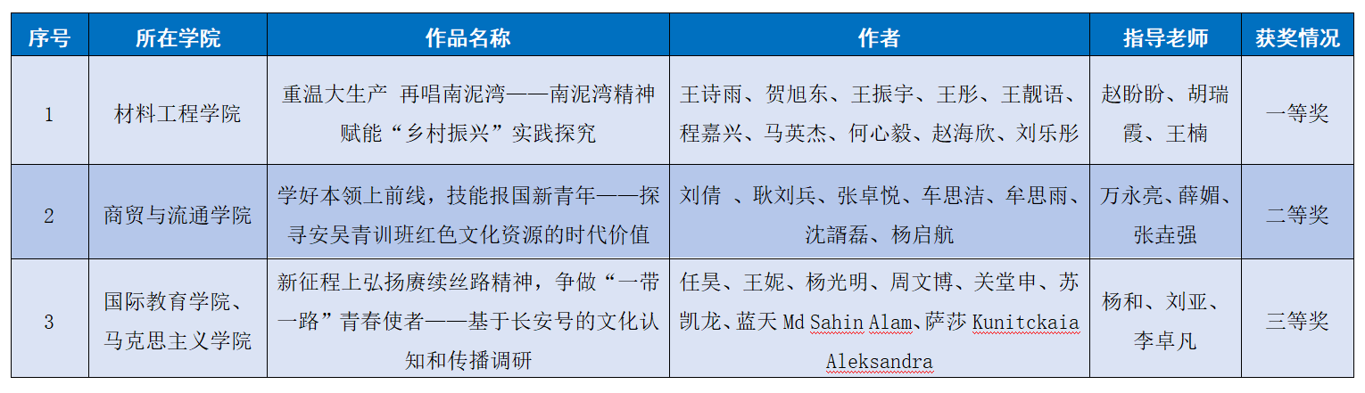 为做好第十八届“挑战杯”红色专项活动的备赛工作,我校于今年2月起开始精心组织校赛方案,经过广泛动员,鼓励学生跨专业组建参赛团队组队,引导学生将专业所学与社会实践相结合,走入社会,重走红色路线、挖掘红色故事、体悟红色文化;经过培训动员,共征集到来自全校的一百余件作品,通过资格审查、线上+线下培训、作品打磨,结合专家综合评审共推荐四十余件作品进入省赛。经省赛组委会评选,最终我校材料工程学院团总支选送作品《重温大生产再唱南泥湾--南泥湾精神赋能“乡村振兴”实践探究》荣获一等奖,商贸与流通学院团总支选送作品《学好本领上前线,技能报国新青年--探寻安吴青训班红色文化资源的时代价值》荣获二等奖,国际教育学院联合马克思主义学院选送作品《新征程上弘扬赓续丝路精神 争做“一带一路”青春使者--基于长安号的文化认知和传播调研》荣获三等奖。