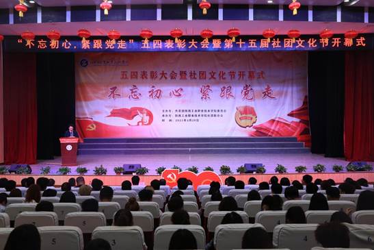 为庆祝中国共产党成立100周年,纪念五四运动102周年,4月29日下午,我校“不忘初心,紧跟党走”五四表彰大会暨第十五届社团文化节开幕式于明德堂举行。党委副书记贺天柱、党委副书记田昊、党委宣传部部长黎炜、党委组织部部长王超联、党委学工部部长、学生处处长郝军,各二级学院党总支书记、团总支书记以及团员代表1200余人参加了大会。会议由团委书记赵双军主持。